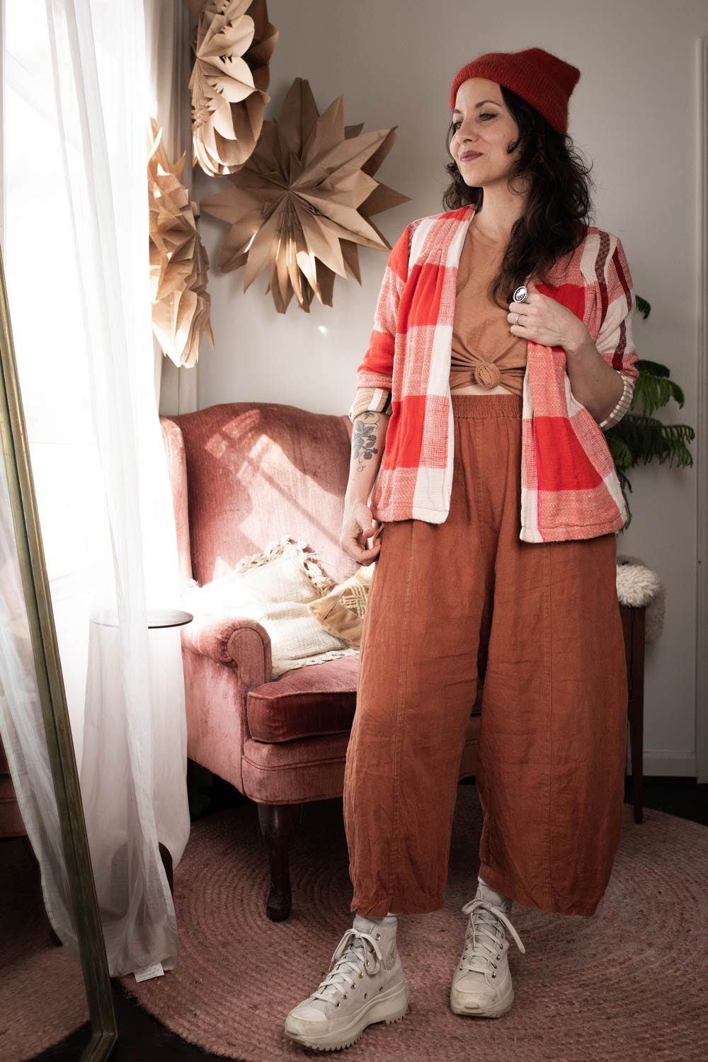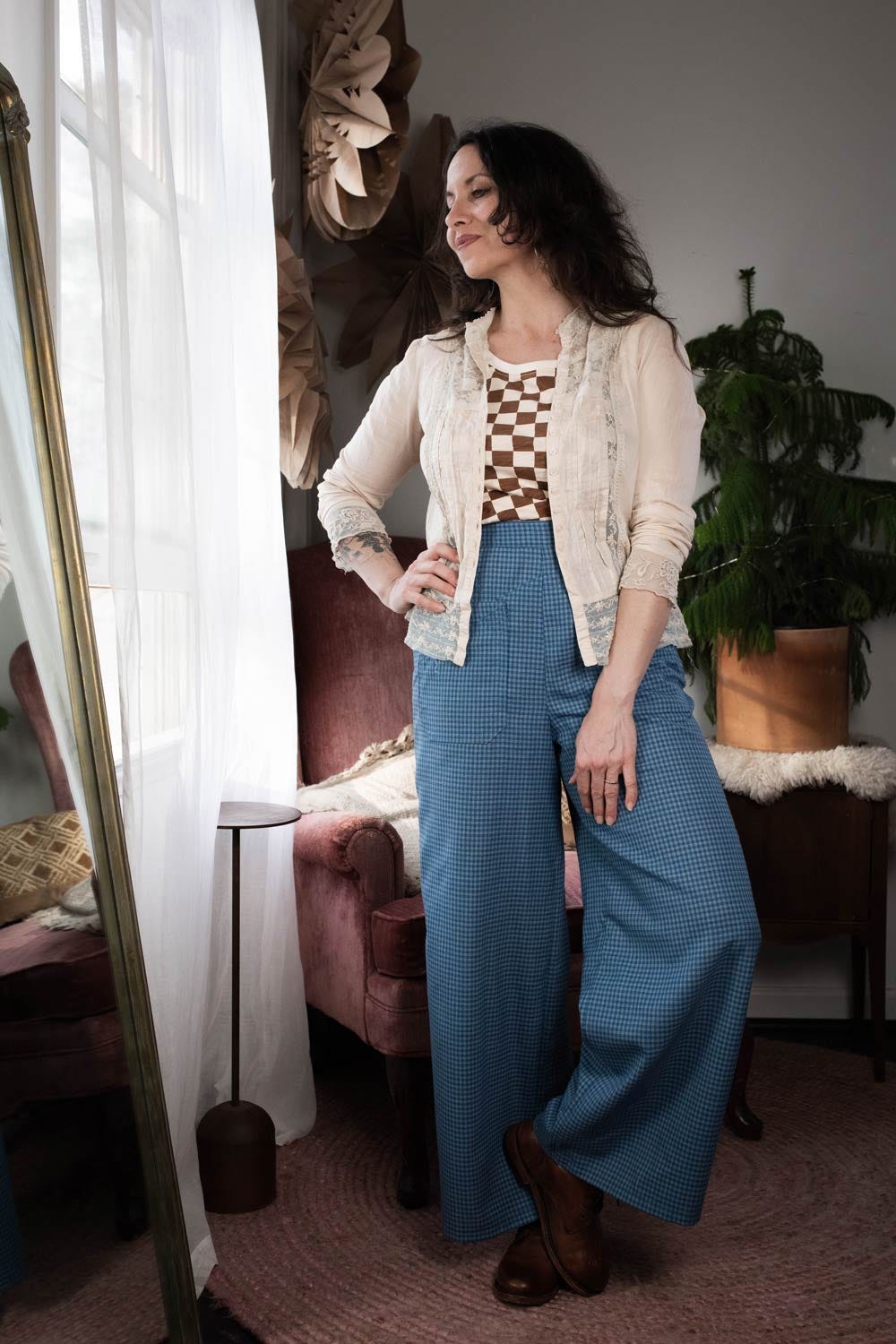 What I’m wearing in this post: 1st photo: wool crepe Cosecha Pants, checkerboard Bedrock tank, + a thrifted lace buttondown. 2nd photo: linen Arthur Pants, Bedrock Tee sleeveless view B tied in the front, secondhand Ace & Jig jacket, + a hand knit Oslo Hat in the Pomegranate colorway from Knitting for Olive.